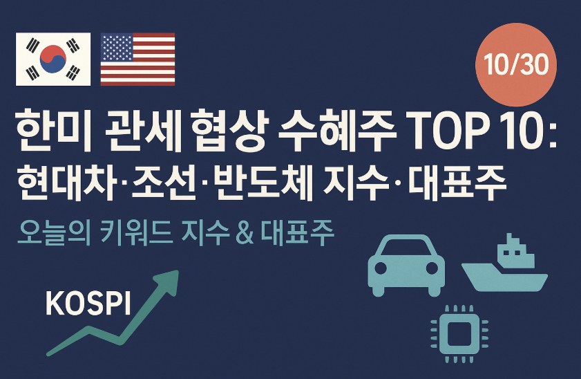 한미 관세 협상 수혜주 TOP 10은 10월 30일자 기준으로 분석하였고, 현대차·조선·반도체 지수·대표주 등 중심으로 정리해 드리겠습니다.