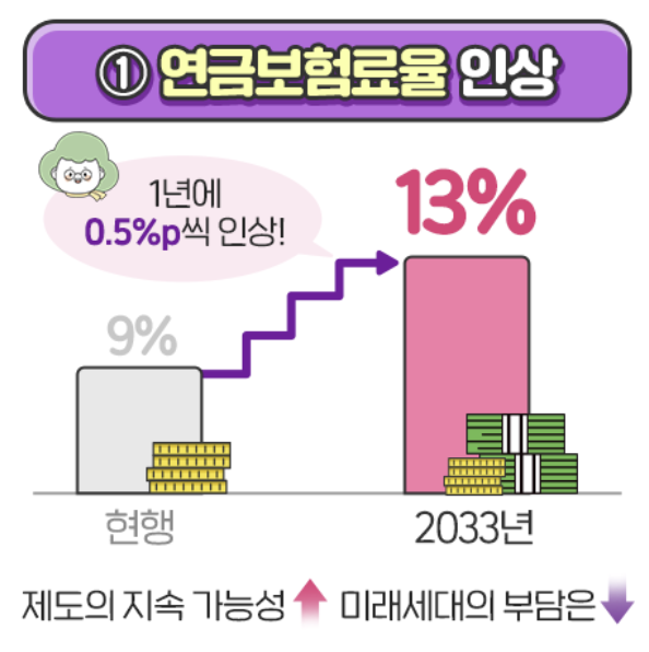 연금개혁에 따라 보험료율은 2033년까지 매년 0.5%p씩 인상되어 최종적으로 13%에 도달할 예정입니다. 대신 소득대체율(40년 가입 기준)은 2026년부터 43%로 올라, 나중에 받는 연금액은 더 커지는 방향입니다.