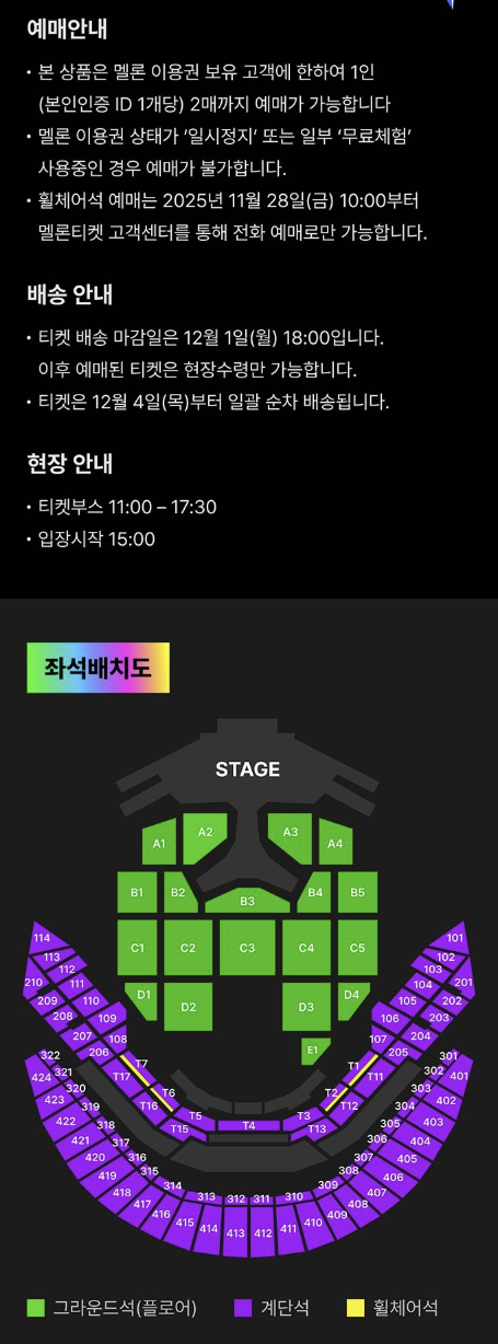 → 멜론 계정과 국내 결제 수단만 있으면 해외 거주자도 예매 가능해요. 대신 공연장 입장할 땐 여권 등 신분증 지참이 필수입니다.