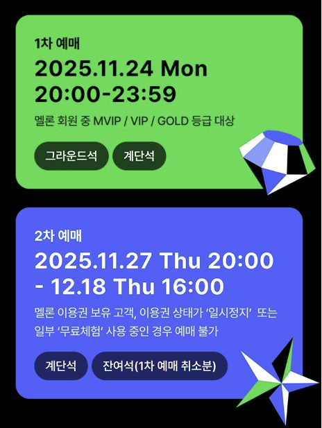 | 2차 일반 예매 | 11월 27일(목) 20:00~ | 모든 멜론 유료 이용권 보유자 | 계단석 + 1차 취소분 잔여석 |