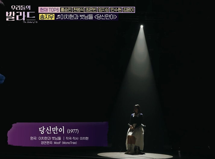 송지우는 이치현과 벗님들의 〈당신만이〉를 “반려동물이 주인에게 전하는 마음”이라는 새로운 시선으로 풀어냈습니다. 몽환적인 음색과 섬세한 프레이징 덕분에, 익숙한 곡이지만 전혀 다른 감정으로 들렸던 무대.