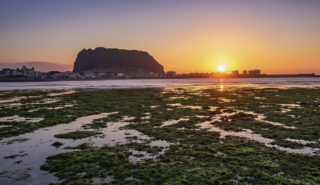 성산일출봉의 전체 실루엣과 그 옆으로 떠오르는 해를 동시에 담을 수 있는 최고의 사진 포인트입니다. 광치기 해변보다 인파가 적고 물이 빠졌을 때 드러나는 이끼 낀 바위들이 몽환적인 분위기를 자아냅니다.