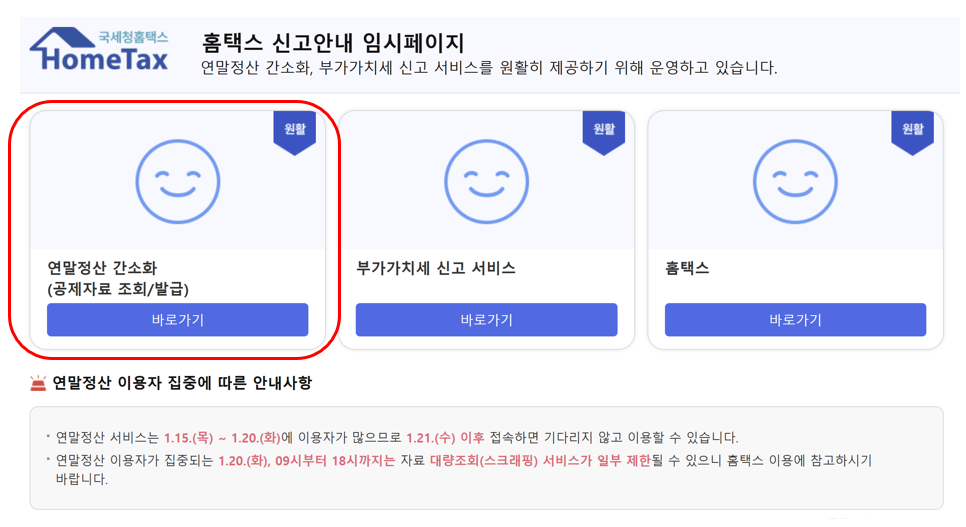 ⚠️ 주의사항: 1월 15일에 바로 조회하면 일부 의료비나 교육비가 누락되어 보일 수 있습니다. 이는 기관 제출 속도 차이 때문이며, 반드시 1월 20일 이후에 다시 확인하여 최종본을 제출하시기 바랍니다.