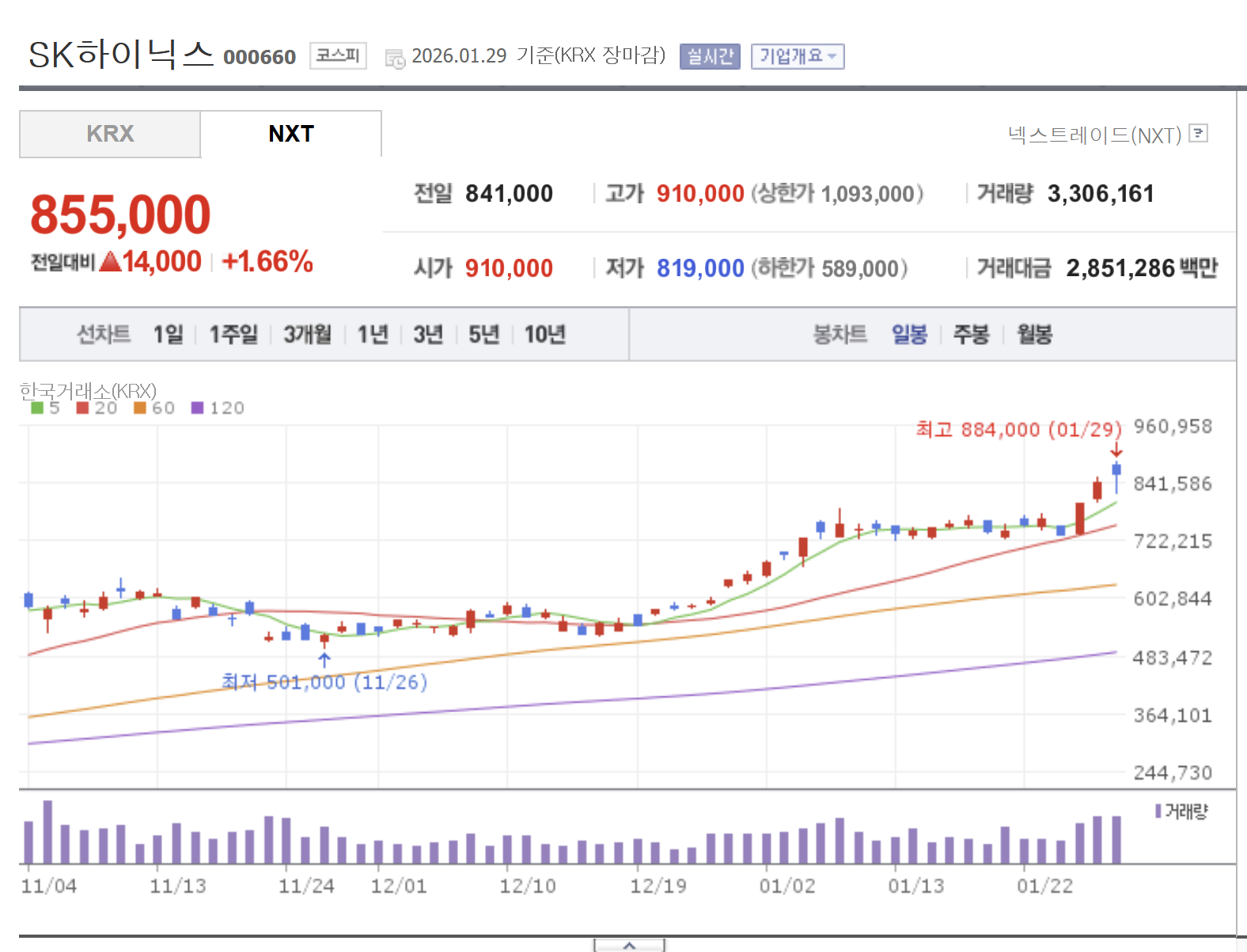 HBM 시장의 압도적 점유율을 바탕으로 목표주가가 95만 원에서 최대 100만 원 이상으로 제시되었습니다. '백만닉스'라는 단어가 시장의 공식적인 기대치로 자리 잡은 상황입니다.