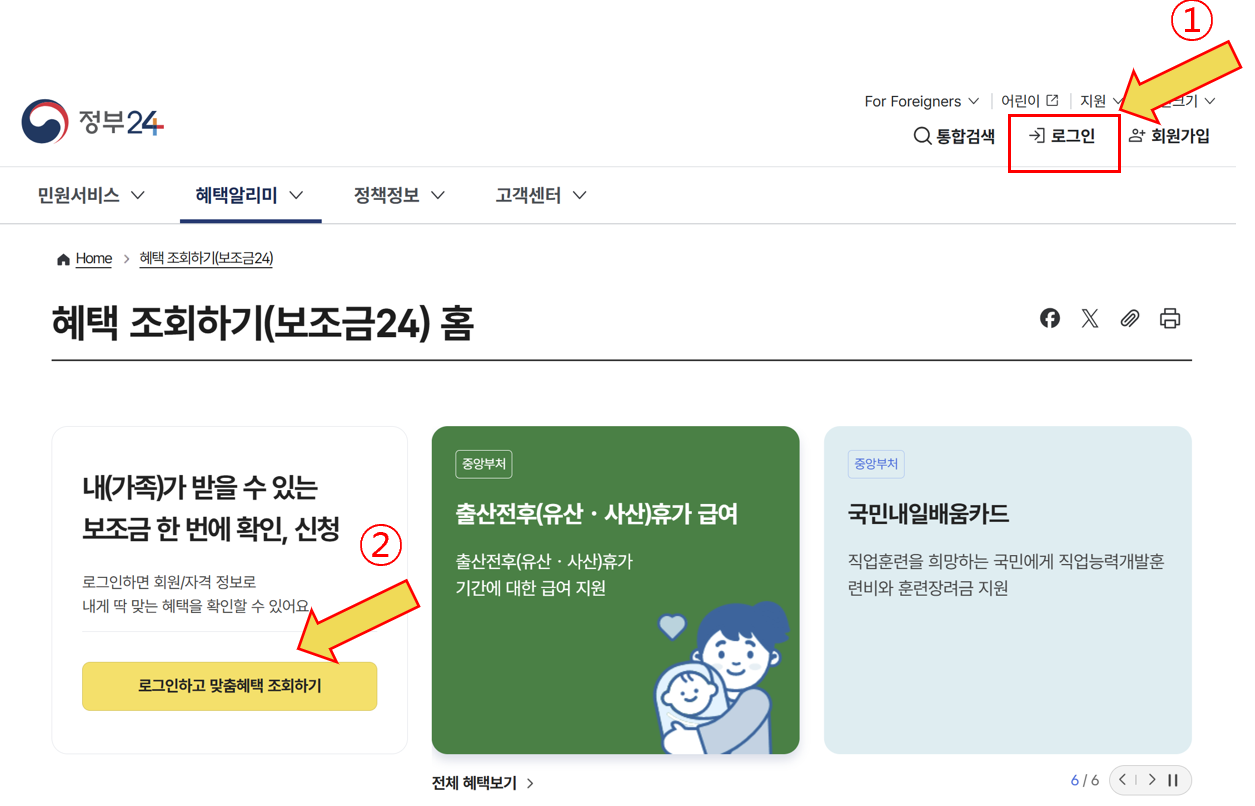 - 조회 방법: [정부24 홈페이지/앱] 접속 → 로그인 → [보조금24] 클릭 → '나의 혜택' 확인