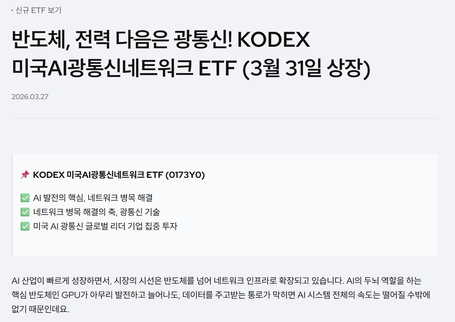 KODEX 미국AI광통신네트워크 ETF처럼 밸류체인 전체에 접근하는 방식입니다. 특정 종목 리스크를 줄이면서 광통신 테마 전체 흐름에 접근하고 싶은 투자자에게 더 적합할 수 있습니다.