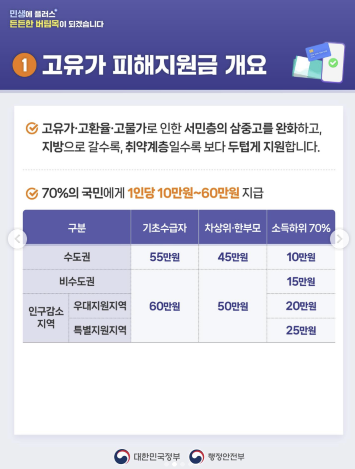- 정부는 국민 70%를 대상으로 1인당 10만~60만원의 고유가 피해지원금을 지급합니다.