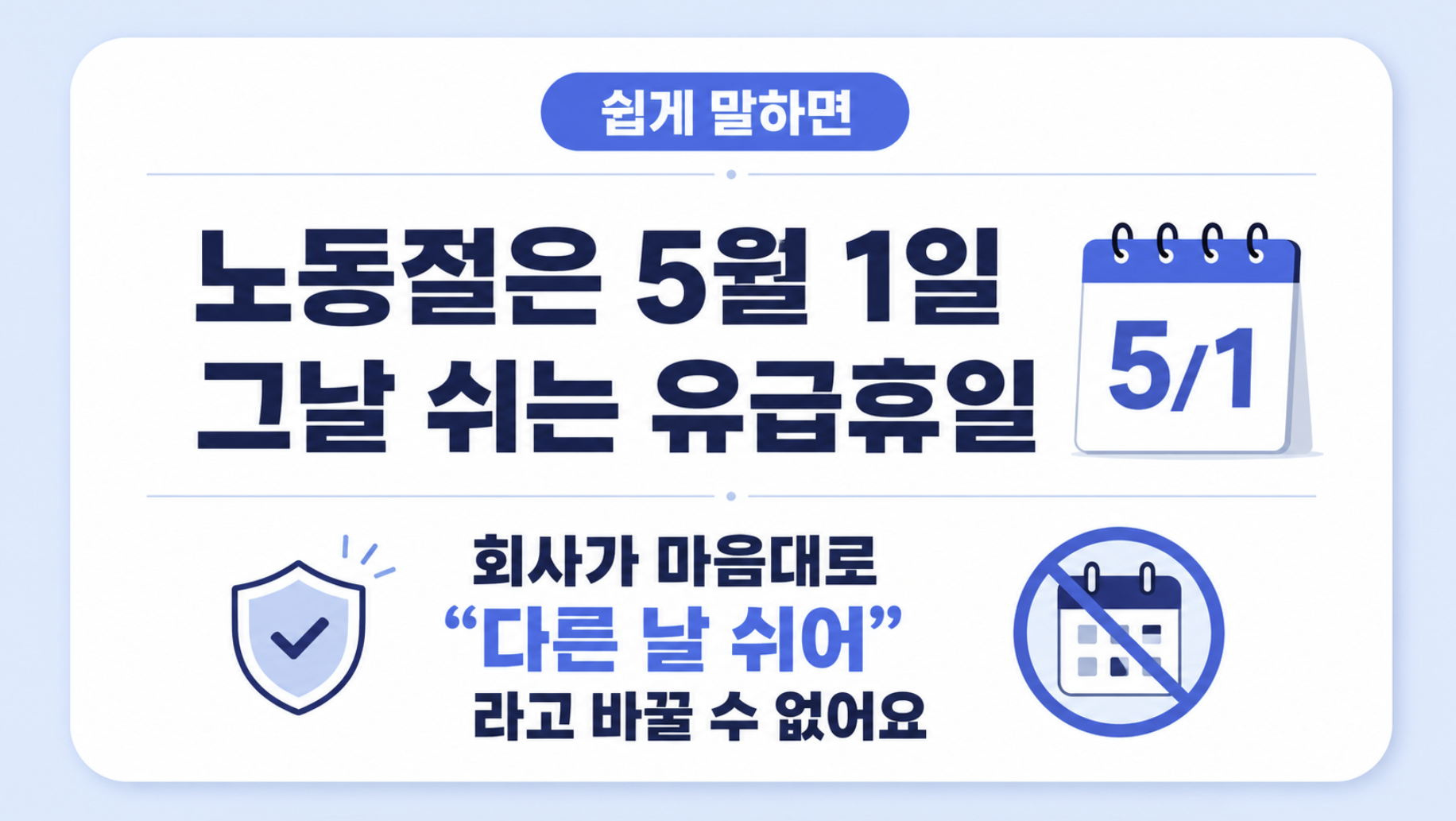 노동절은 5월 1일을 특정해 정한 유급휴일이기 때문에 일반 공휴일처럼 단순히 다른 날로 대체하기 어렵다는 고용노동부 해석도 나왔습니다. 따라서 회사가 “다른 날 쉬면 된다”고 안내했다면, 실제로는 휴일대체인지, 보상휴가인지, 수당 지급 대상인지를 구분해서 확인해야 합니다.