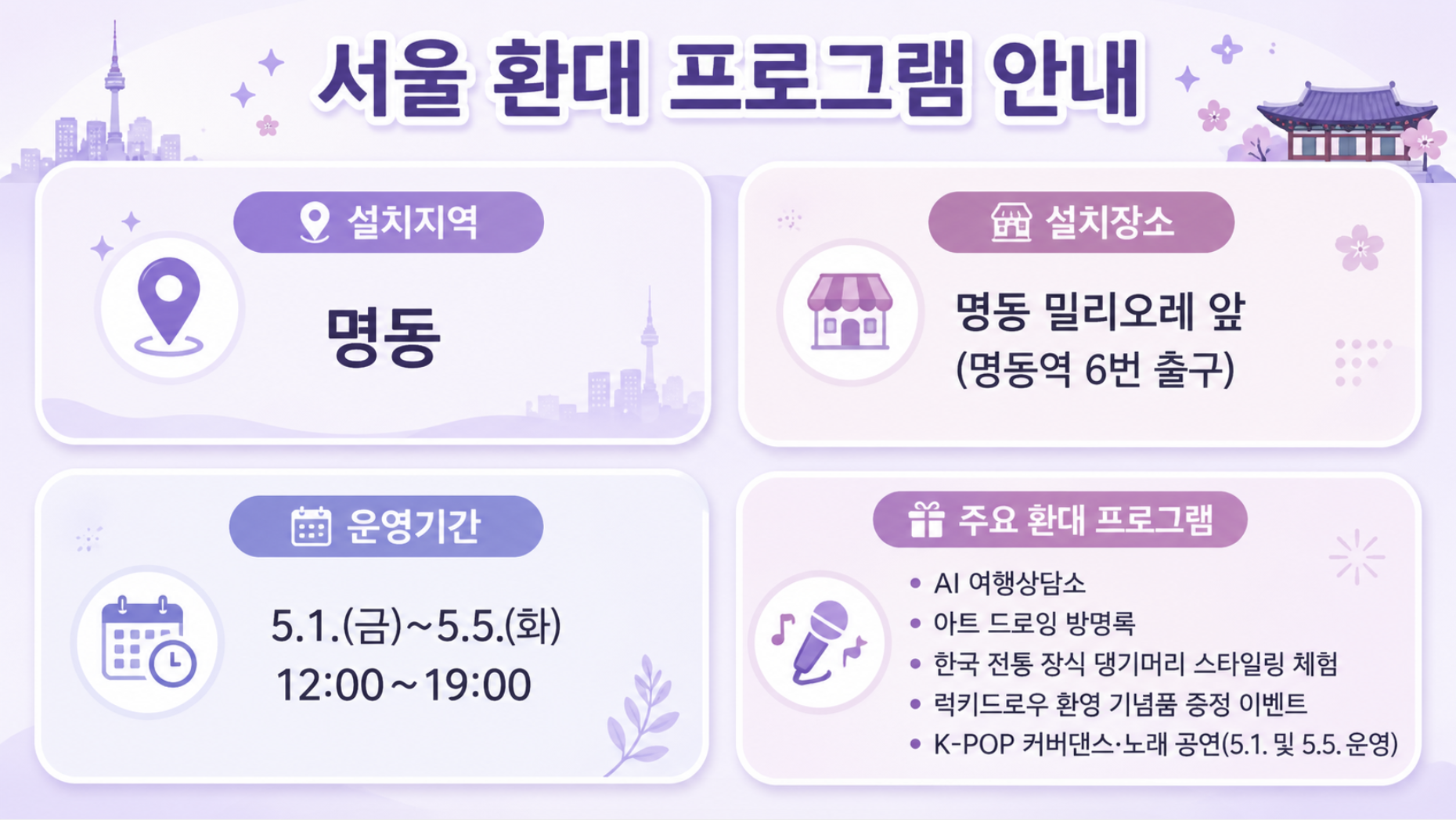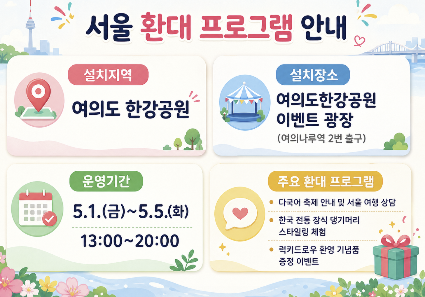 ③ 특히 2026년 5월 1일~5월 5일에는 SEOUL WELCOME WEEK가 명동과 여의도에서 열려 외국인 관광객에게 좋은 체험 포인트가 될 수 있습니다.