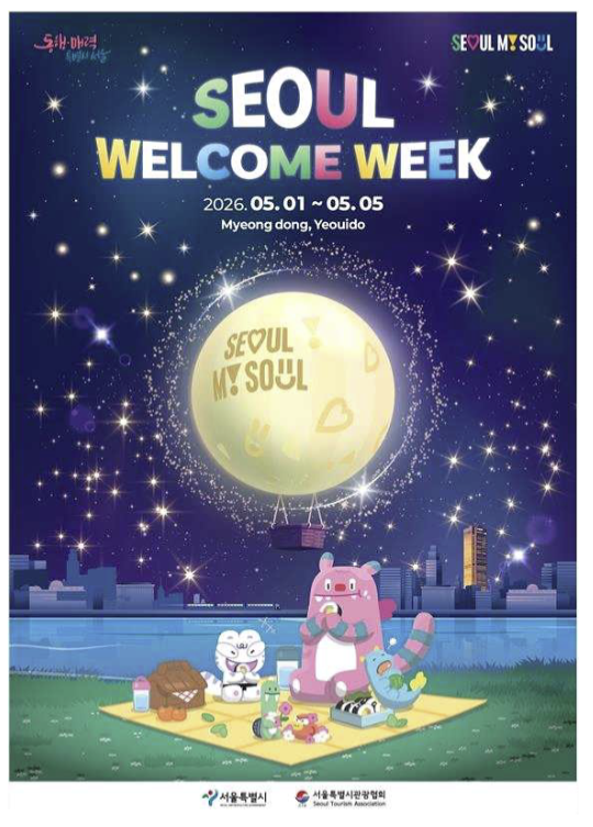 첨부 포스터를 보면 2026년 5월 1일부터 5월 5일까지 SEOUL WELCOME WEEK가 명동과 여의도에서 진행됩니다. 이 시기는 어린이날 연휴와도 겹치기 때문에 서울을 찾는 외국인 관광객이 도심과 한강을 함께 즐기기 좋은 기간입니다.