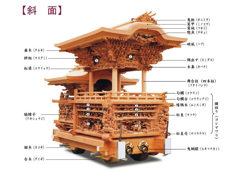 - '단지리'의 예술품 조각: 단지리에는 정교한 조각들이 빽빽하게 새겨져 있습니다. 예술품 조각으로 이루어진 가격은 1억 엔( 약 9억 원)을 넘습니다. '단지리'가 쉬고 있을 때 참관을 요청하면 '단지리'를 자세히 볼 수가 있습니다.