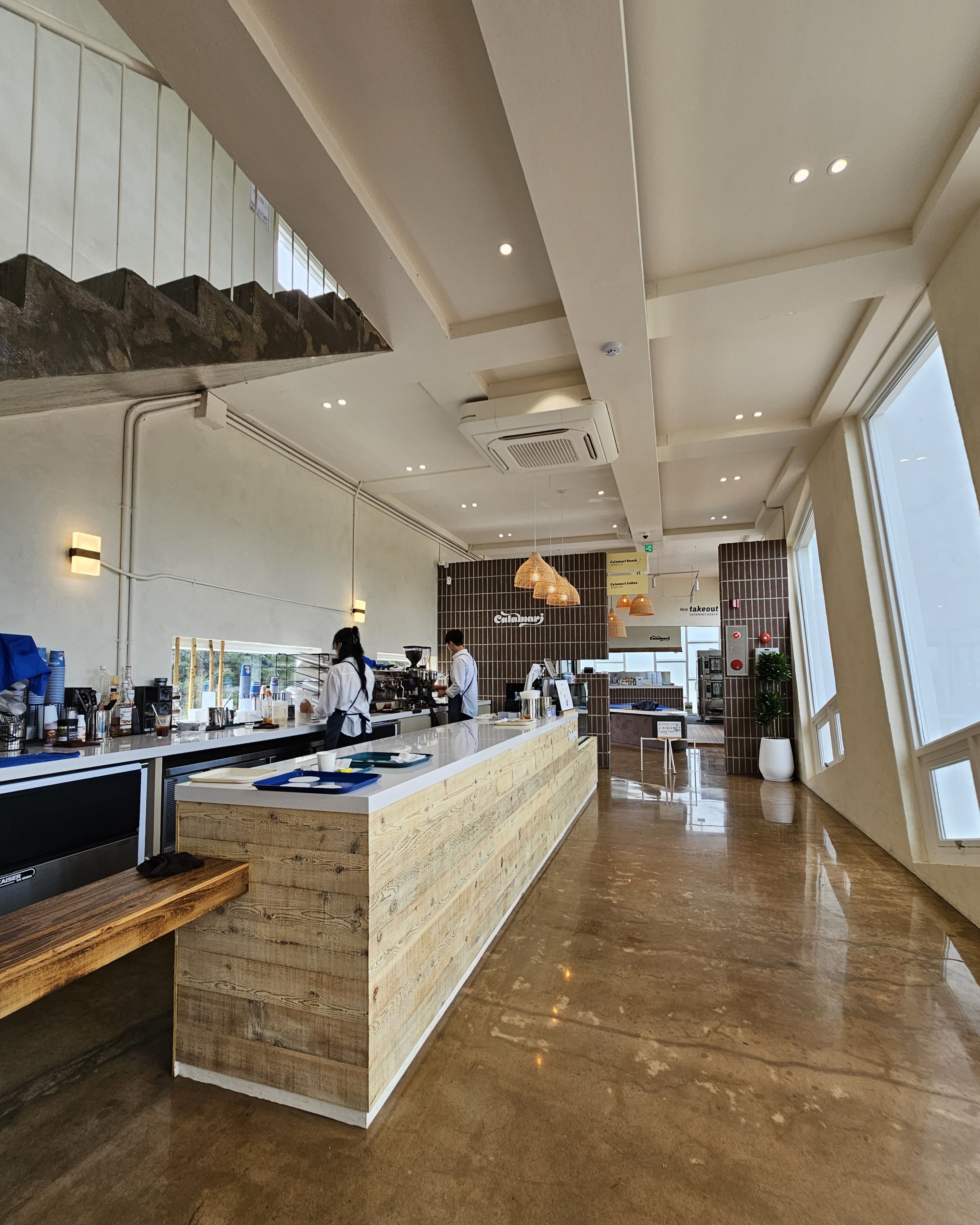 사천면 바다를 마주하고 있는 바다 앞의 흰색건물, 마치 '바다 위 험한 파도와 바람에 흔들리는 듯한 오징어 배' 모습을 하고 있는 이국적인 건물, 카페 '깔라마리'가 저의 첫인상입니다. 처음 봤을 때 심하게 기울어져 있어서, 저 건물 괜찮은 건가 싶을 정도... 하지만 건물만 비스듬하게 기울어진 콘셉트일 뿐, 카페 분위기, 내부 컬러 디자인, 시그니쳐 라테맛 모두 최고였습니다. 아래의 맨 왼쪽 사진은 넓은 주차장으로 들어와 주차 후, 찍은 건물 사진입니다. 옆에서 본 흰색건물 윗부분에 파란색의 Calamari 글씨가 보이네요. 카페 앞, 바다가 보이는 방향으로 편하게 쉴 수 있는 커다란 쿠션과 테이블도 있고, 깨끗한 흰색과 나무로 이루어진 카페 내부, 은은한 조명과 어우러진 커피 향, 카페라기보다는 휴양지에 놀러 온 느낌이 강하게 느껴지는 곳, 단순하게 커피만 즐기고 가기에는 너무 많은 포토 스폿, 약간 휴양지 같은 느낌의 카페였습니다.