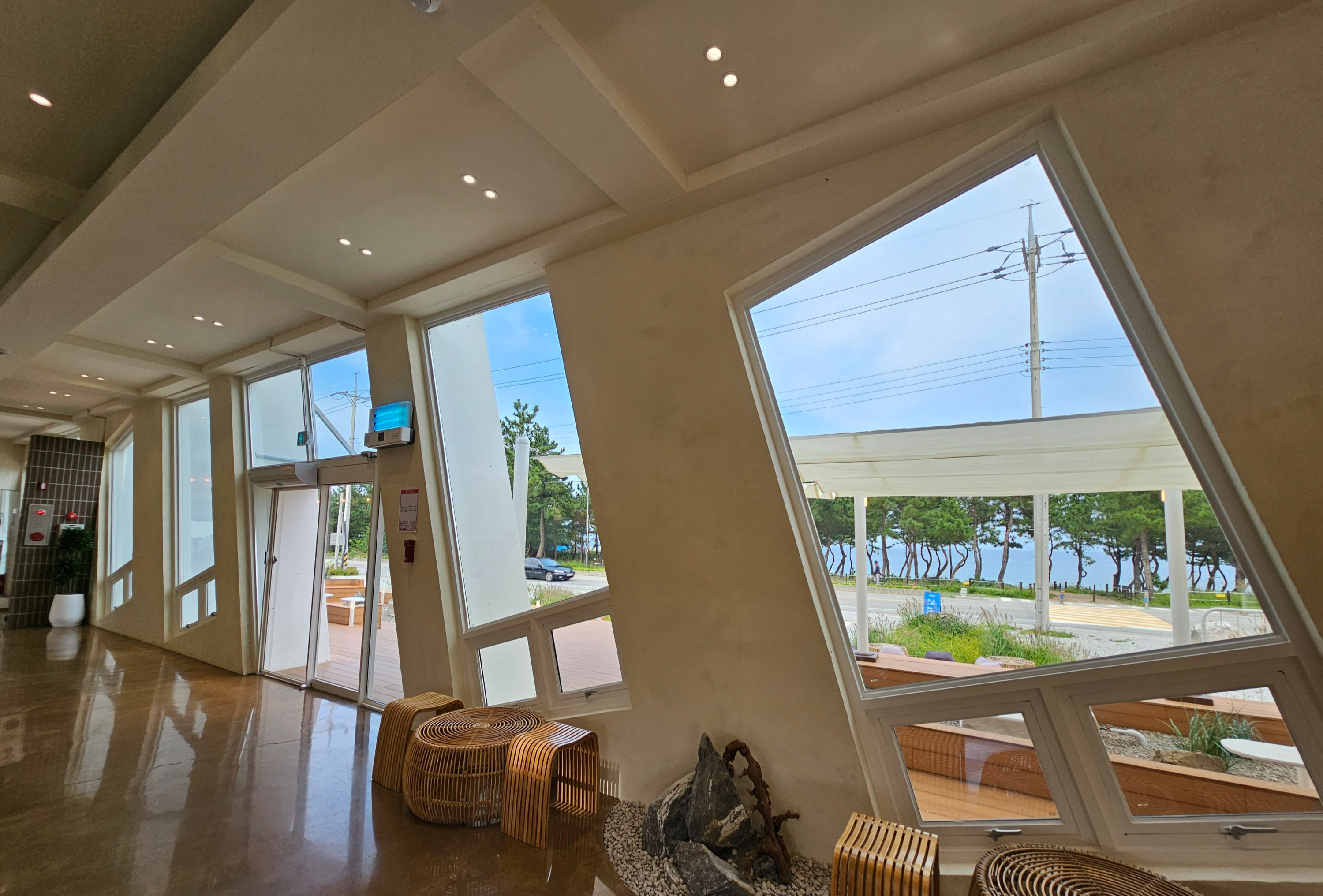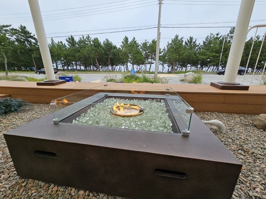 루프탑에서 사진도 찍고, 깨끗한 화장실에서 손도 씻고 나오면서 기울어진 창 밖으로 또 다른 모습의 좌석이 보였어요. 쿠션과 테이블 그리고 불멍을 때릴 수 있는 커다란 화로가 있었습니다. 밖으로 나와 잠시 쿠션에 앉아 바닷바람을 맞으며, 불멍도 때리면서, 오길 잘했네!라는 마무리 느낌까지 좋았습니다.
